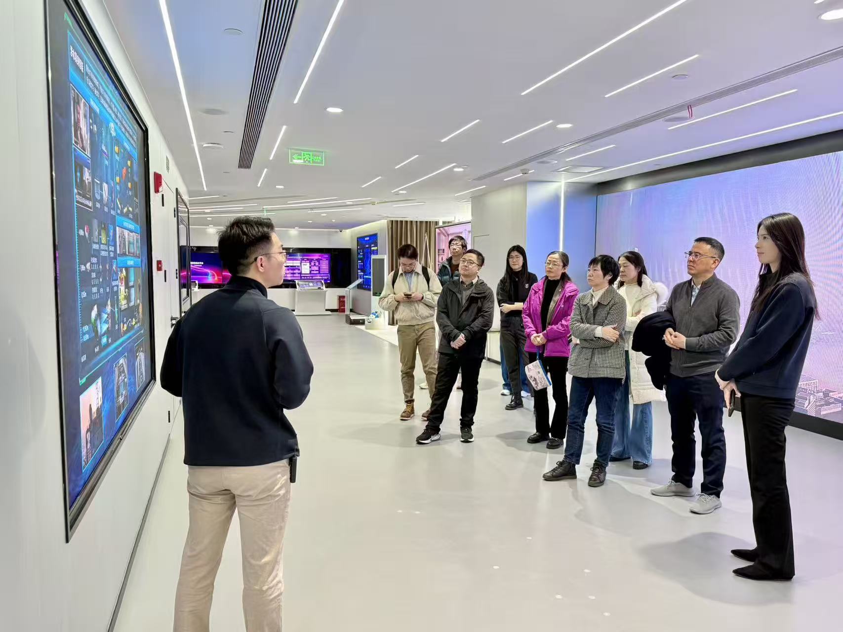 交流伊始,梅永丰副院长一行参观了中国电信人工智能展厅,通过实地观摩前沿技术成果、体验创新应用场景,复旦教师团队对中国电信在大模型、智传网(AI Flow)、世界模型、具身智能等研究领域的技术积淀与创新成效有了直观且深入的了解,为后续合作搭建了认知基础。
